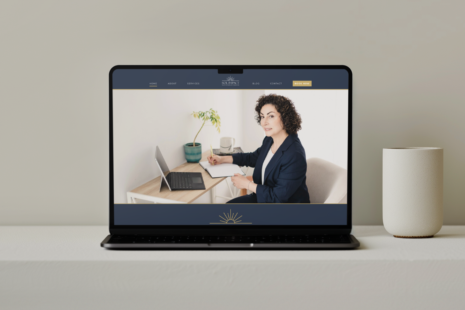 The visual branding integrated seamlessly into the website, especially with the help of the beautiful brand images Jennifer provided. These photos added depth, warmth, and a sense of presence that made the site feel personal rather than abstract. The navy and gold palette created a polished, professional foundation, while subtle greens and sun-inspired elements added softness and grounding. Together, the structure, copy, visuals, and brand elements created a digital experience that feels spacious, trustworthy, and aligned — a clear reflection of the Sol Impact coaching experience.