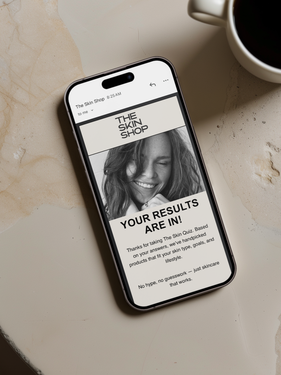 Once the quiz was complete, we integrated the results directly into Klaviyo. This allowed us to trigger personalized follow-up emails with the customer’s recommendations, reinforce education, and support customers who needed more time before purchasing. It also helped with long-term segmentation, allowing The Skin Shop to market in a more thoughtful and relevant way.